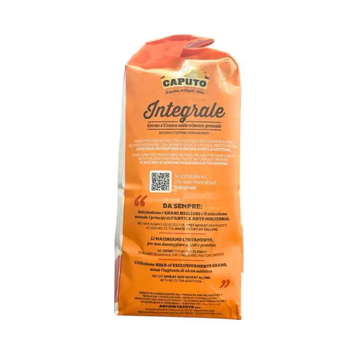 Issue du moulin Caputo au cœur de Naples, cette farine rassemble le grain dans son intégralité : blé tendre, germe et son. Une mouture traditionnelle qui respecte le goût originel du blé complet.