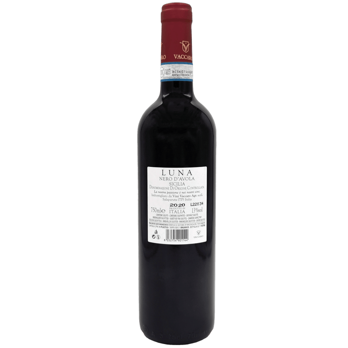 Le Nero d'Avola Luna Vaccaro est un vin pur, sans ajout d’allergènes. Il est entièrement naturel, à base de raisins Nero d'Avola de la région de Sicile.